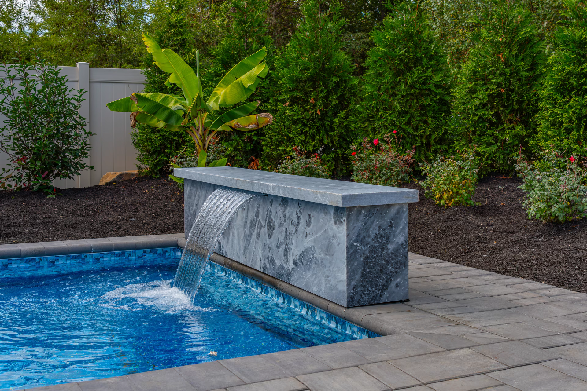 Bring refreshment and relaxation to your backyard with this Formal Skyfall Marble Waterfall. This waterfall is 1.5 feet high and 8 feet wide and features a 24 inch sheer descent of water cascading over the marble. We designed this water feature to be a focal piece on any pool as it is handcrafted from Skyfall Gray marble. This unique design is sure to revitalize and invigorate family and friends.