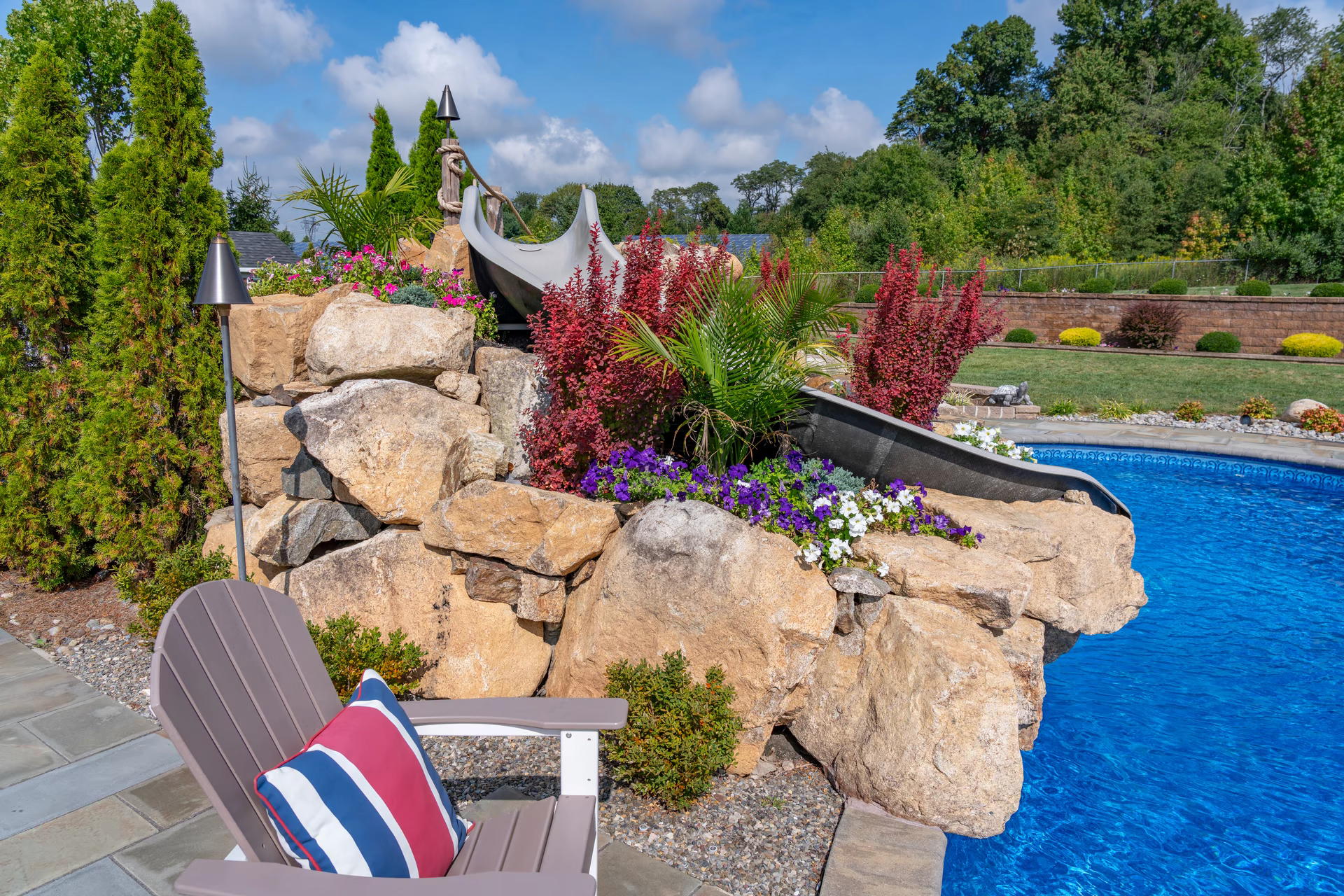 Aquatic Artists was hired to complete a waterfall renovation on this vinyl pool in Hamilton, NJ. We removed an existing water feature with a slide and then designed and crafted this deluxe natural stone waterfall combined with a deluxe pool slide. The waterfall we built is 5 feet high and it is two-tiered and splits into two streams cascading into this pool. Also, we installed a deluxe slide and built natural stone steps with cedar posts and rope railings leading up to the slide. Lastly, we built a retaining wall on the back of the waterfall and placed planting beds throughout this water feature to enhance the natural look.