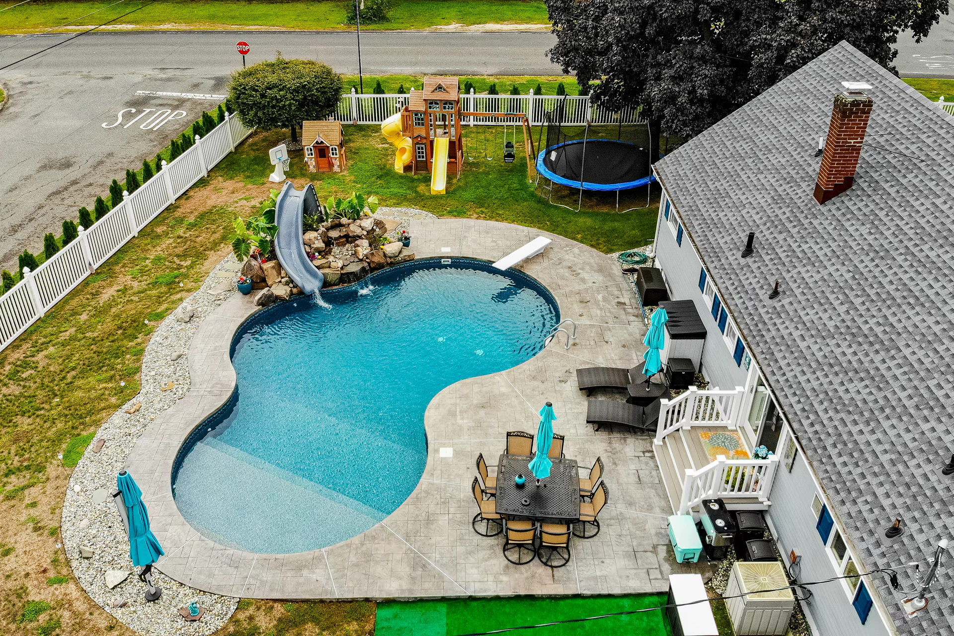 Aquatic Artists designed and crafted this large natural stone grotto combined with a deluxe semi-custom pool slide on this gunite pool in Millstone, NJ. The grotto we built is 5 feet high and has a front and a side entrance. The slide is manufactured by SR Smith and we built natural stone steps with cedar posts and rope railings leading up to the slide. Lastly, we installed accent rocks around the pool, and we placed planting beds throughout this water feature to enhance the natural look.