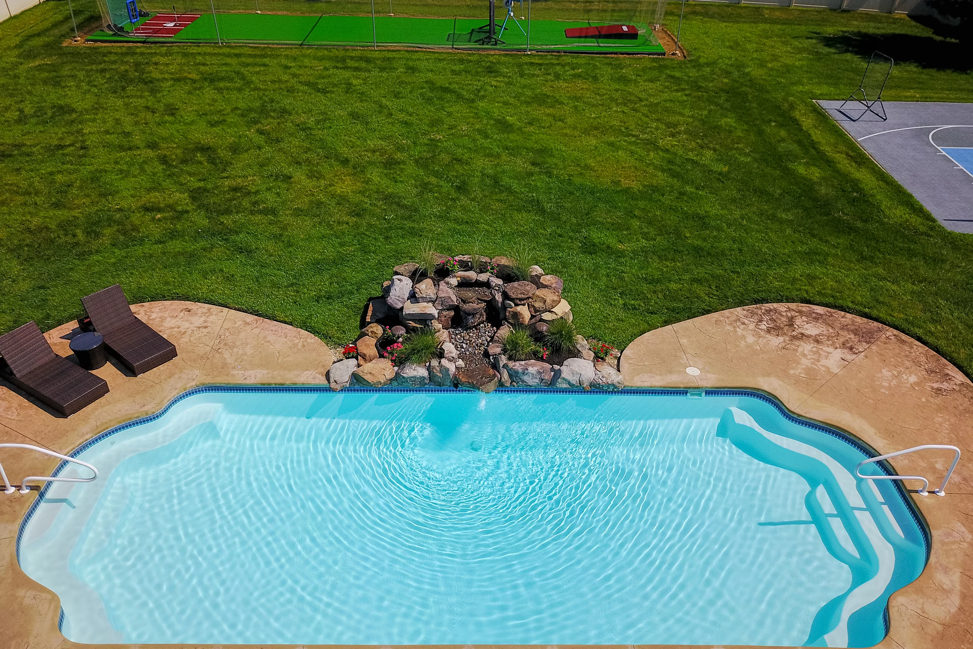 Aquatic Artists crafted this pool waterfall and pond combination in Shamong, NJ. The first water feature is a 3 feet high natural stone waterfall that splits into two streams and cascades into this gunite pool. The second water feature is a natural stone pond and stream. We created each of these water features with their own separate filtration system. Also, we placed planting beds throughout these water features to enhance the natural look.