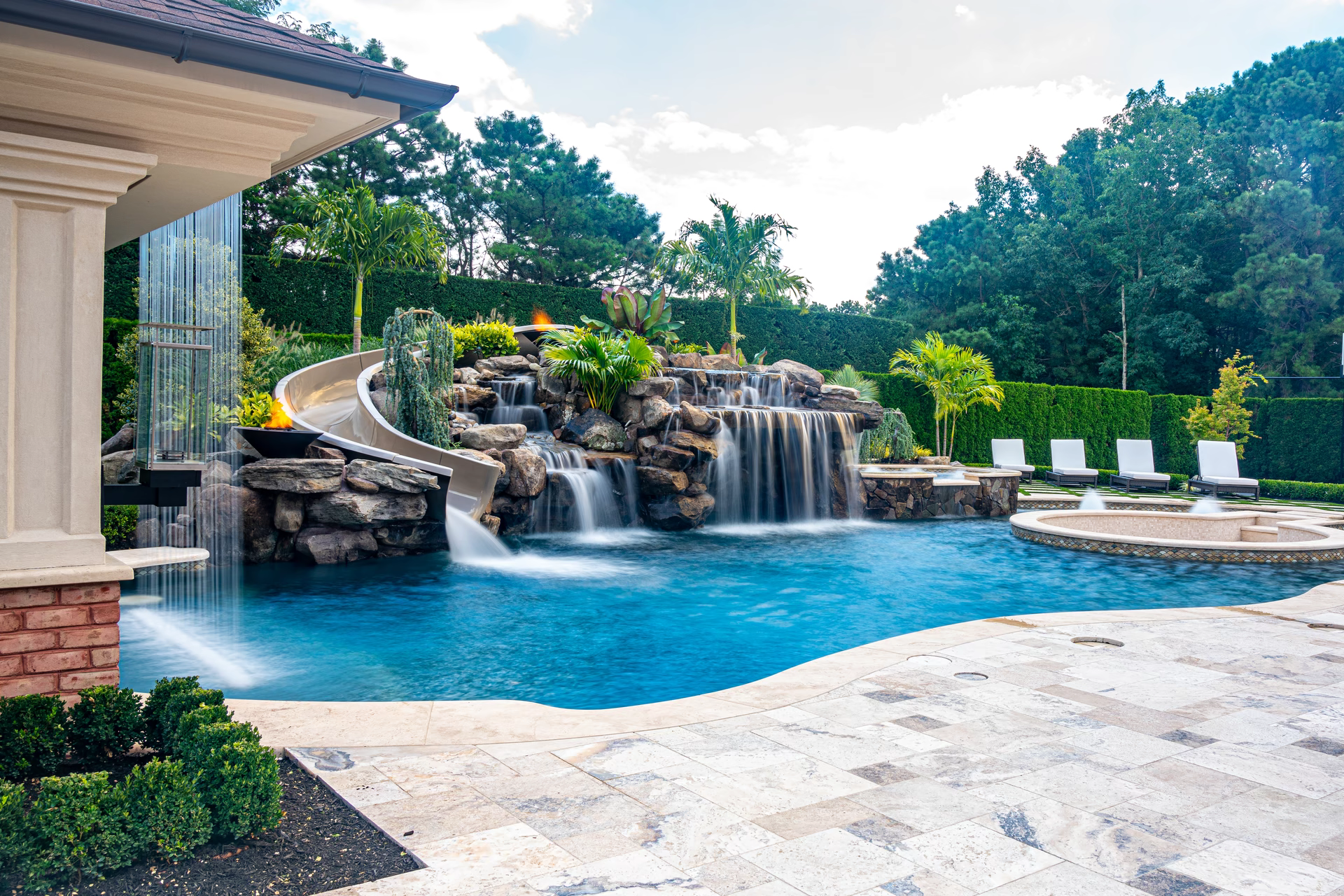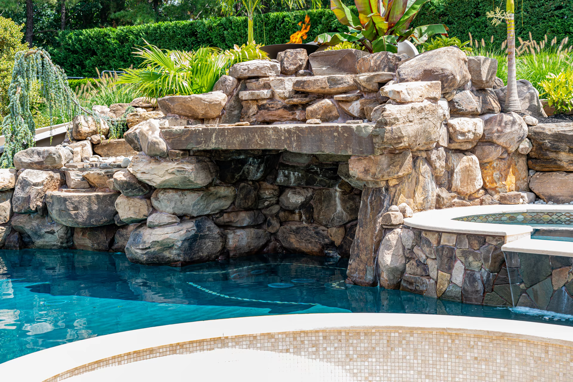 To the left of the grotto, we crafted a two-tiered 6 foot high waterfall that cascades into the pool and we installed a 40 foot custom pool slide manufactured by Dolphin Water Slides. Leading to the pool slide and the top of the grotto cave, we built natural stone steps that wrap around a 10 foot tall pillar rock that weighs five tons. The steps also have cedar posts and rope railings.