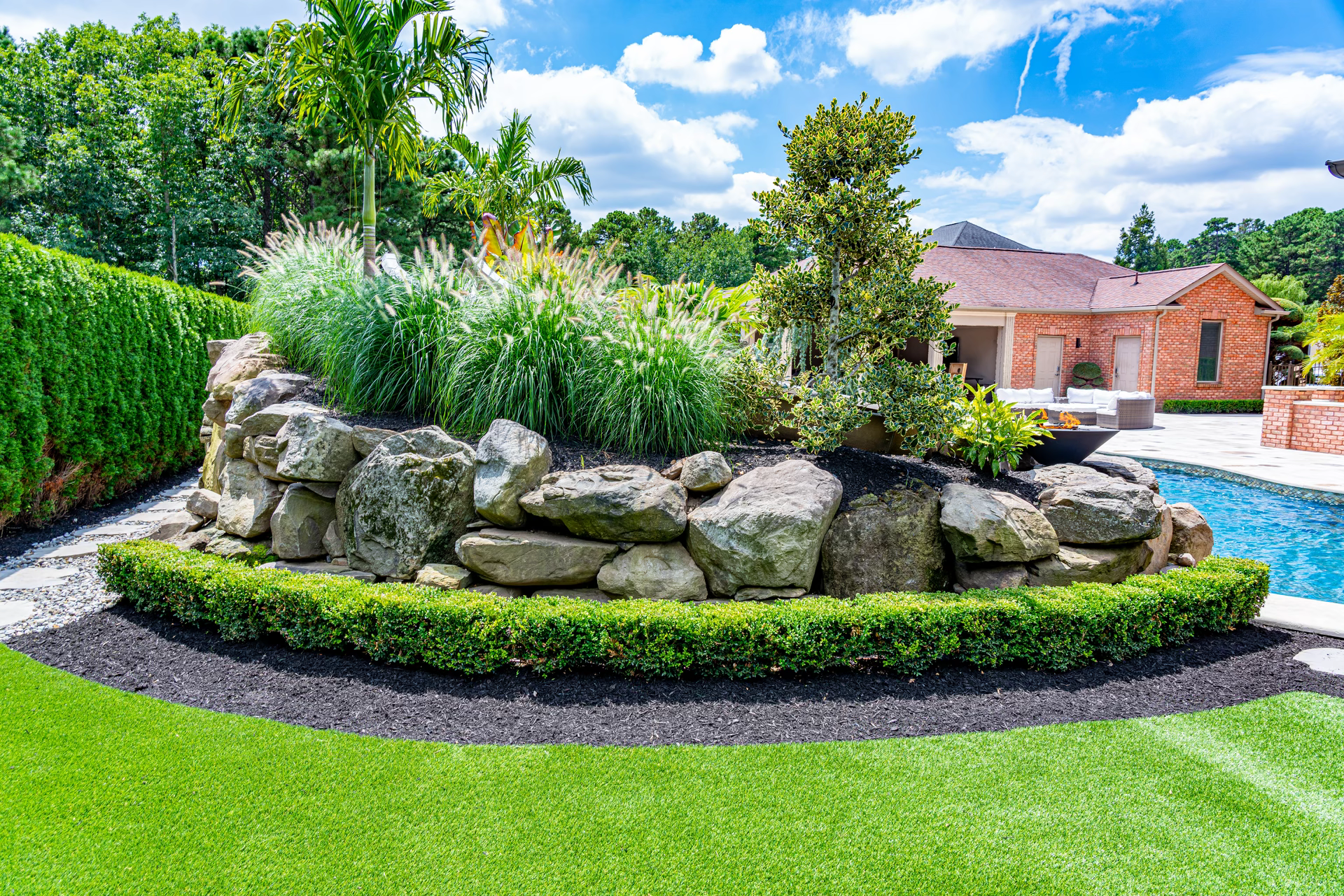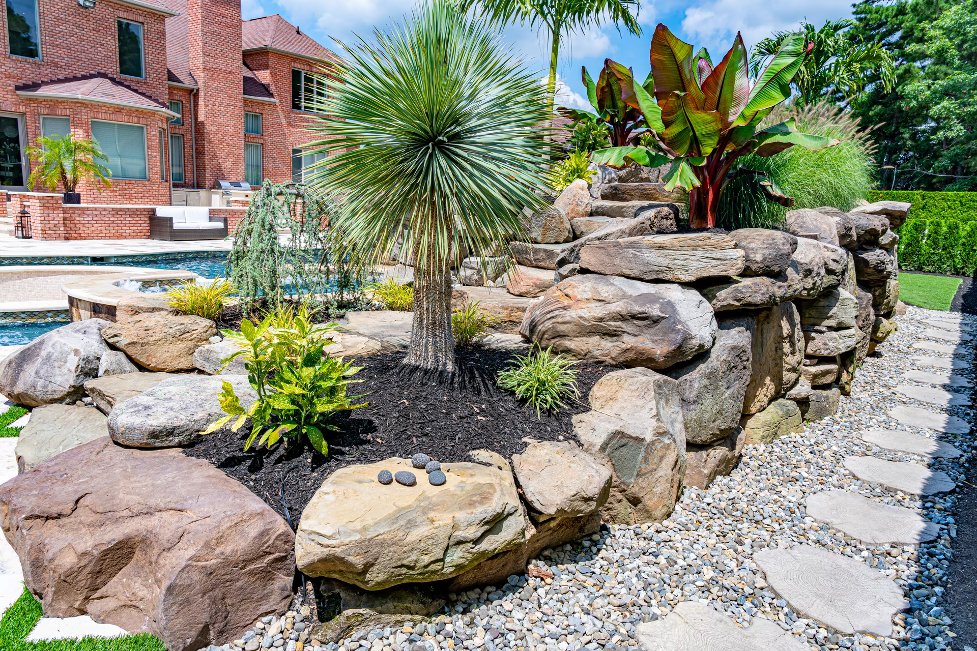 In addition, we built a second 4 feet high natural stone water feature that slopes down a hill on the backside of the house facing the pool. The second water feature, a multi-tiered natural pondless waterfall, includes a stream and planting beds.