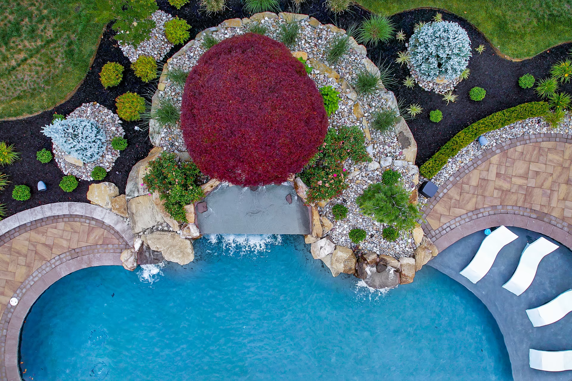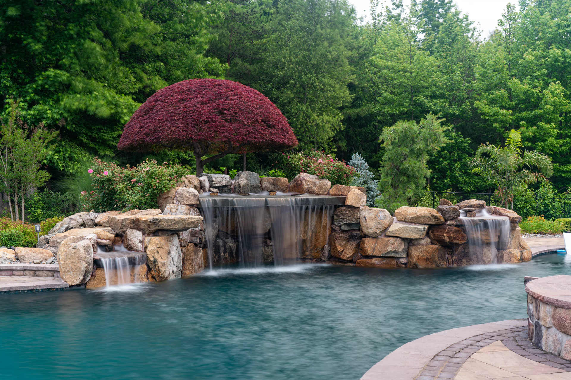 Aquatic Artists designed and built two natural water features at this home in Manalapan, NJ. First, we crafted an award-winning water feature with multiple natural stone waterfalls that cascade into this gunite pool. One of the waterfalls splits into two streams with both streams cascading into the pool. A large 5 feet high waterfall cascades over a pool grotto in the center of the water feature. To the right of the grotto, another waterfall flows on the side of the pool grotto into a stream that also cascades into the pool. We also placed planting beds throughout this water feature.