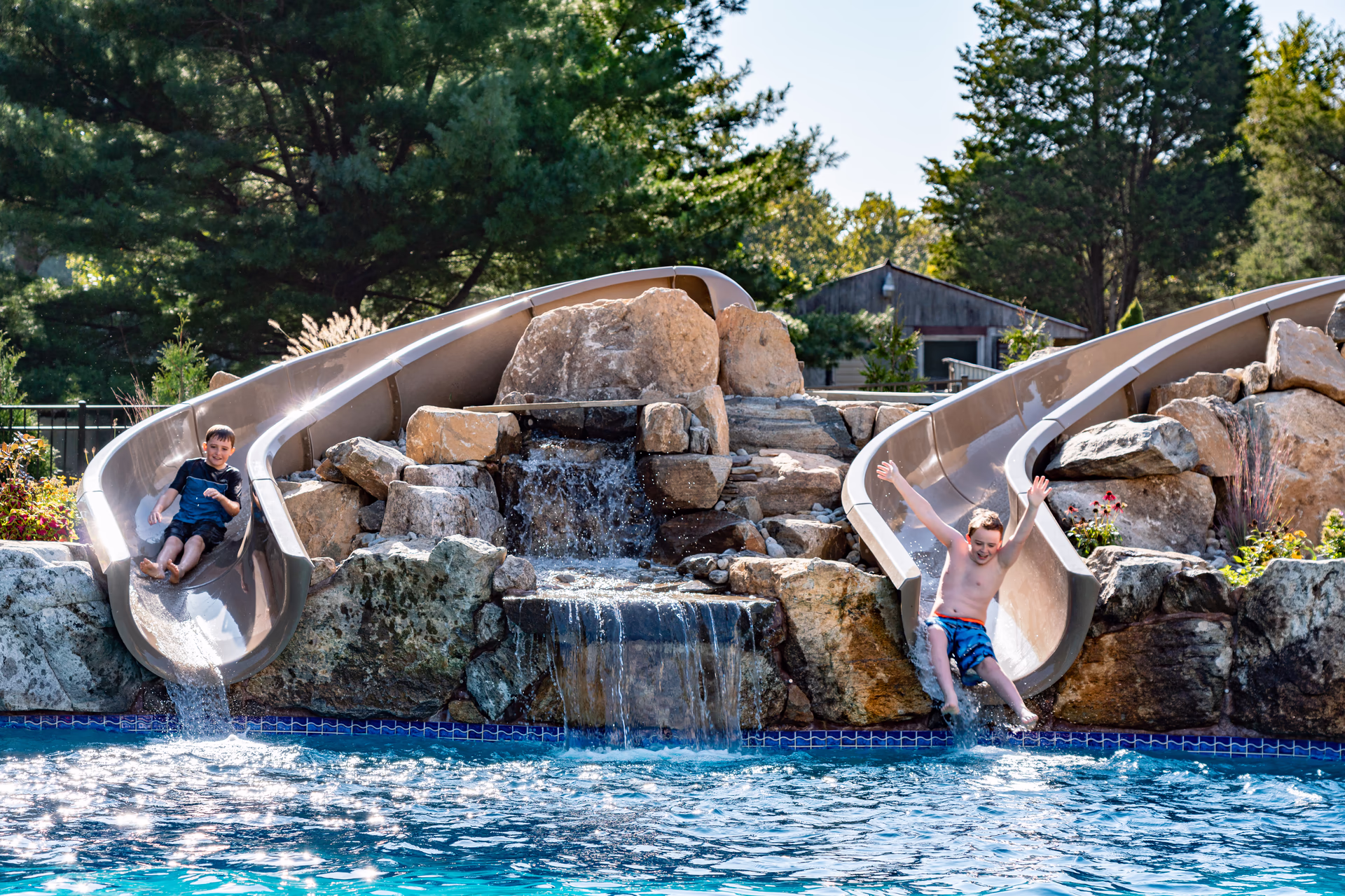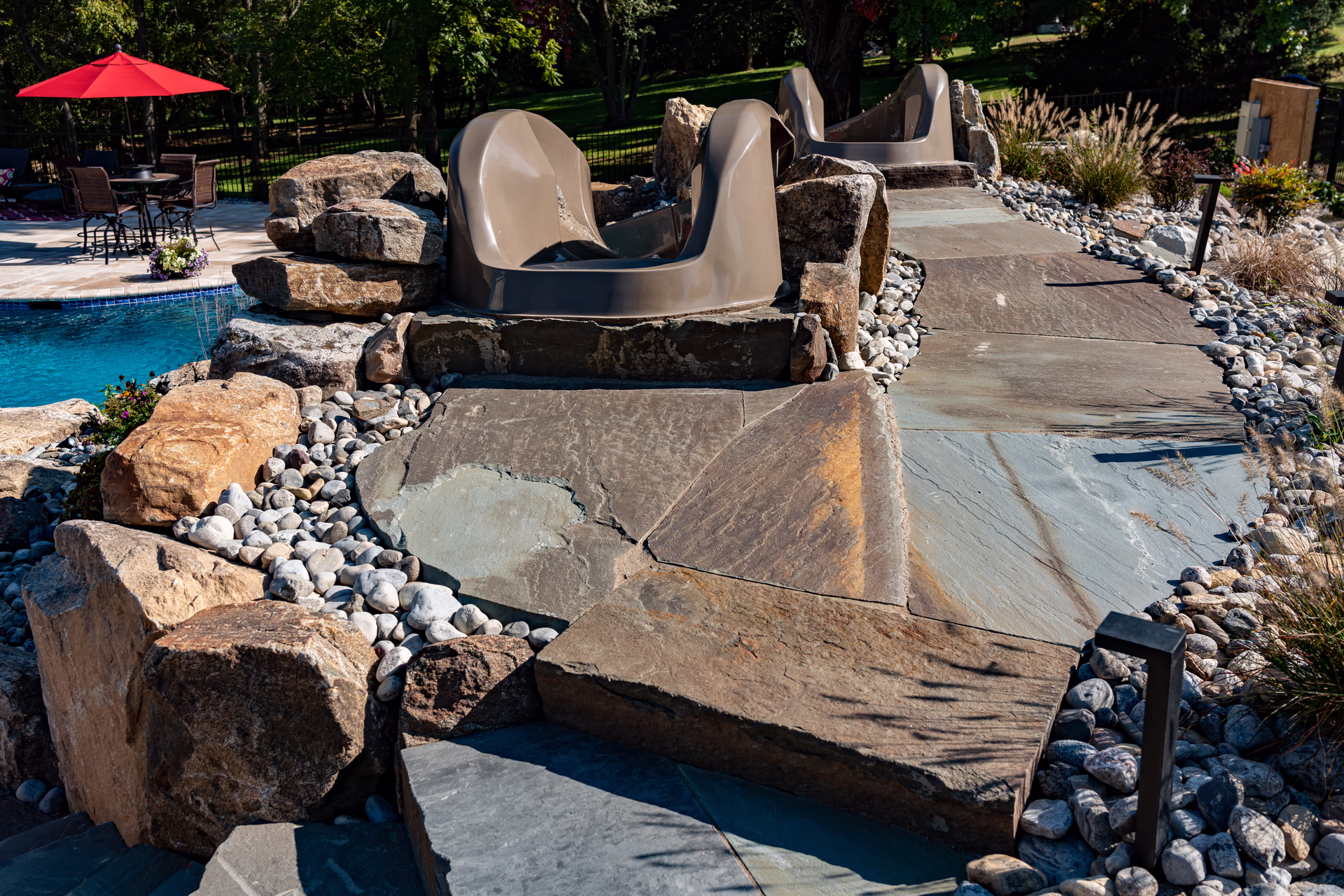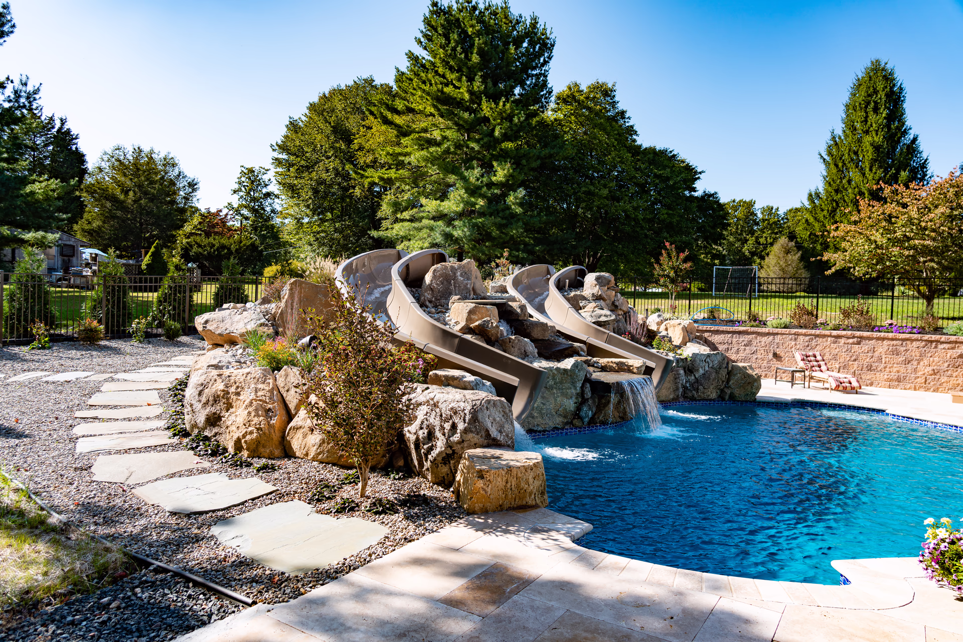 Aquatic Artists crafted this Deluxe grotto and slide project on this gunite pool in Port Republic, NJ. The grotto we built is 5′ high by 5’ wide and 5’ deep and the pool slide is 15’ long. Leading to the pool slide, we built natural stone steps, and we built a boulder wall on the back of the water feature. Also, Aquatic Artists designed and built the entire backyard including patios, firepit, sport court, landscaping, lighting, irrigation, spa installation, and custom stonework.