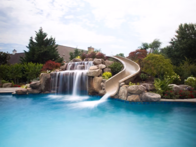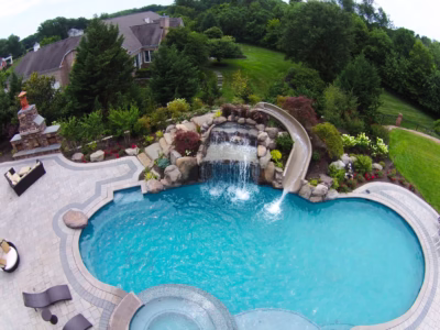 Aquatic Artists designed and built this award-winning natural water feature into a hill in Churchville, MD. We crafted a large pool grotto that is 7 feet high with multiple natural stone waterfalls that cascade into this gunite pool. One of the waterfalls splits into two streams and one of the streams cascades over the pool grotto. We built the other stream of this waterfall to cascade into the spa and designed it so the spa is a waterfall that cascades into the pool. We also installed an ultimate custom pool slide manufactured by Dolphin into this water feature and built natural stone steps that lead up to the slide. In addition, another waterfall on the other side of the pool slide has a stream that also cascades into the pool. Lastly, we placed veneer stone around the face of the spa and installed planting beds throughout this water feature to tie the natural look all together.