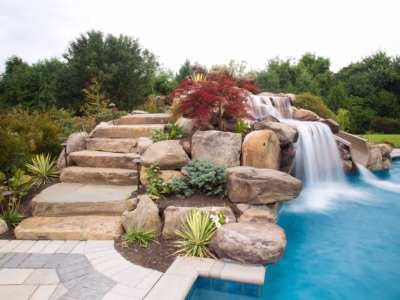 Aquatic Artists designed and built two natural stone water features at this home in Maple Shade, NJ. First, we crafted a 7 feet high waterfall cascading over a grotto that flows into this gunite pool. The second water feature we crafted is a two-tier waterfall located next to the steps and has a stream that flows to the right of the grotto into the pool. In addition, we installed an ultimate custom pool slide manufactured by Dolphin. Leading to the pool slide, we built natural stone steps with cedar posts and rope railings. Lastly, we placed planting beds throughout this water feature to enhance the natural look.