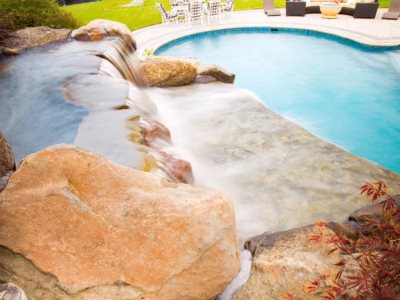 In addition, we created a spa waterfall that cascades into the pool. The spa has 3 large natural accent rocks that we notched around the gunite shell to integrate into the spa. Also, we installed a matching stone veneer on the face of the spa and bullnose travertine coping around the top of the spa. Lastly, we placed planting beds throughout these water features to naturalize the rock.
