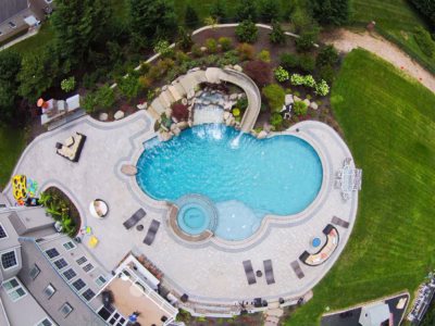 Aquatic Artists was hired to complete a water feature renovation on this gunite pool in Galloway, NJ. We were brought into a project that was not complete because the homeowner was not satisfied with current water feature that was being built. We removed what had been built and then crafted a large 5 feet high natural stone waterfall that cascades over the large pool grotto. Also, we combined this water feature with an ultimate custom pool slide made by Dolphin. Lastly, we placed planting beds and accent rocks around the pool to tie in the natural look of this water feature.