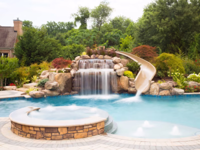 Aquatic Artists designed and crafted this deluxe natural stone grotto combined with a deluxe pool slide on this gunite pool in Mantua, NJ. The grotto we built is 5 feet high and has boulder retaining walls on the back. The slide is manufactured by SR Smith, and we built stone steps leading up to the slide. Also, we placed accent boulders around the pool and spa along with planting beds throughout this water feature to enhance the natural look.