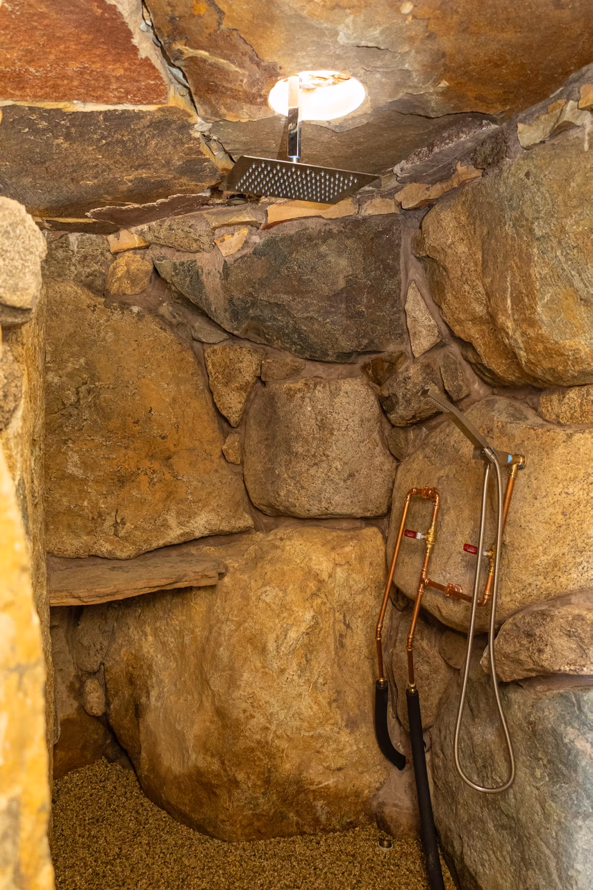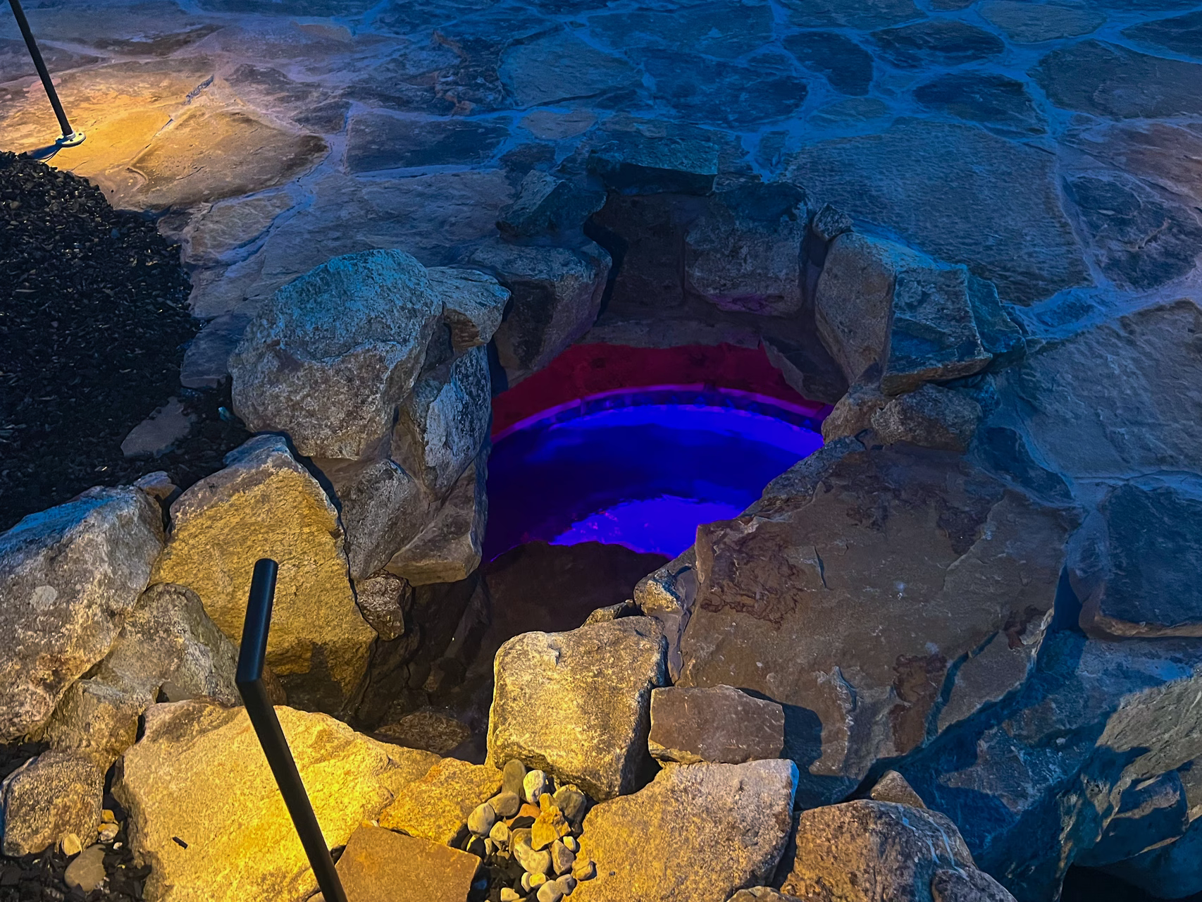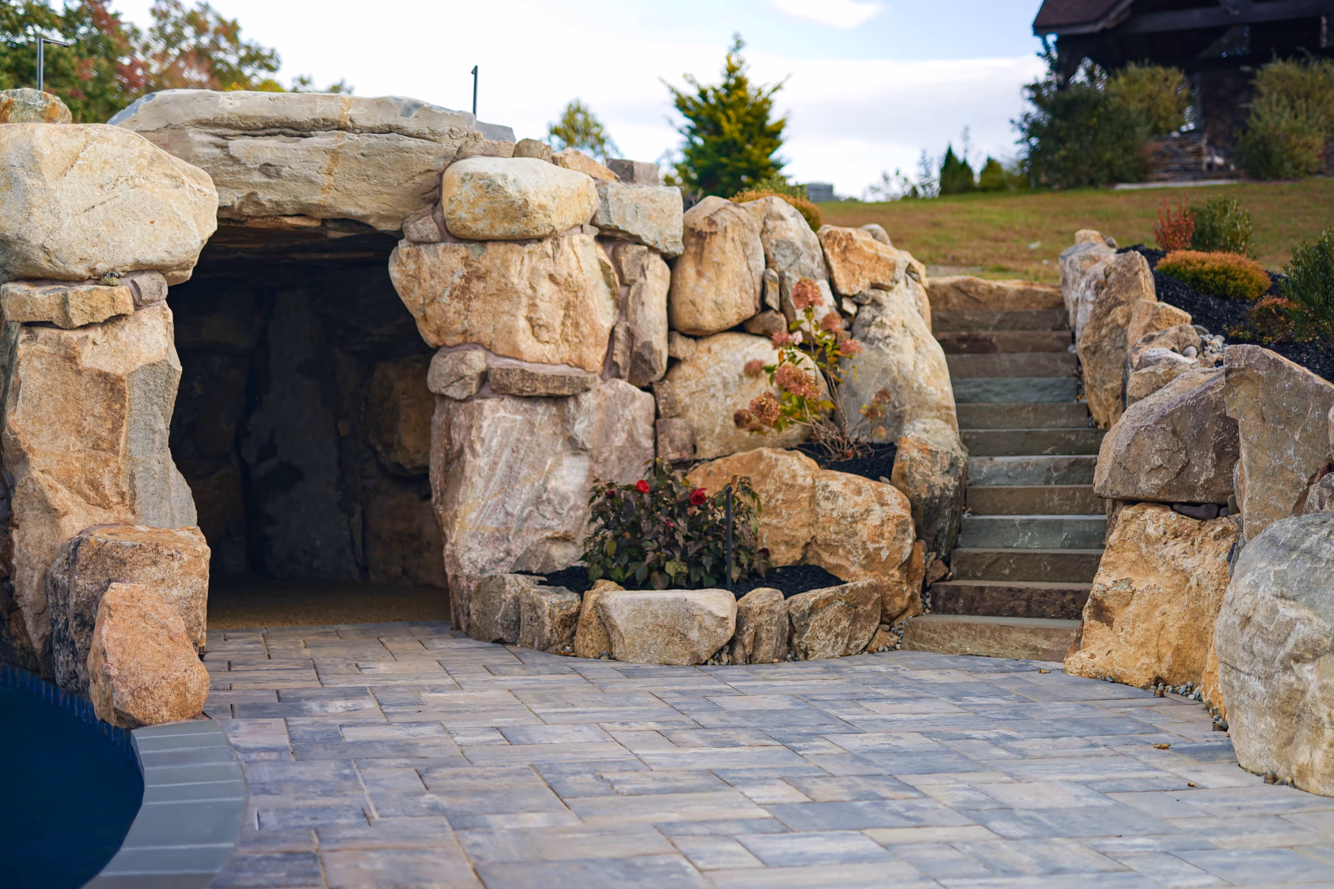 To the left of the grotto, we crafted a two-tiered 6 foot high waterfall that cascades into the pool and we installed a 40 foot custom pool slide manufactured by Dolphin Water Slides. Leading to the pool slide and the top of the grotto cave, we built natural stone steps that wrap around a 10 foot tall pillar rock that weighs five tons. The steps also have cedar posts and rope railings.