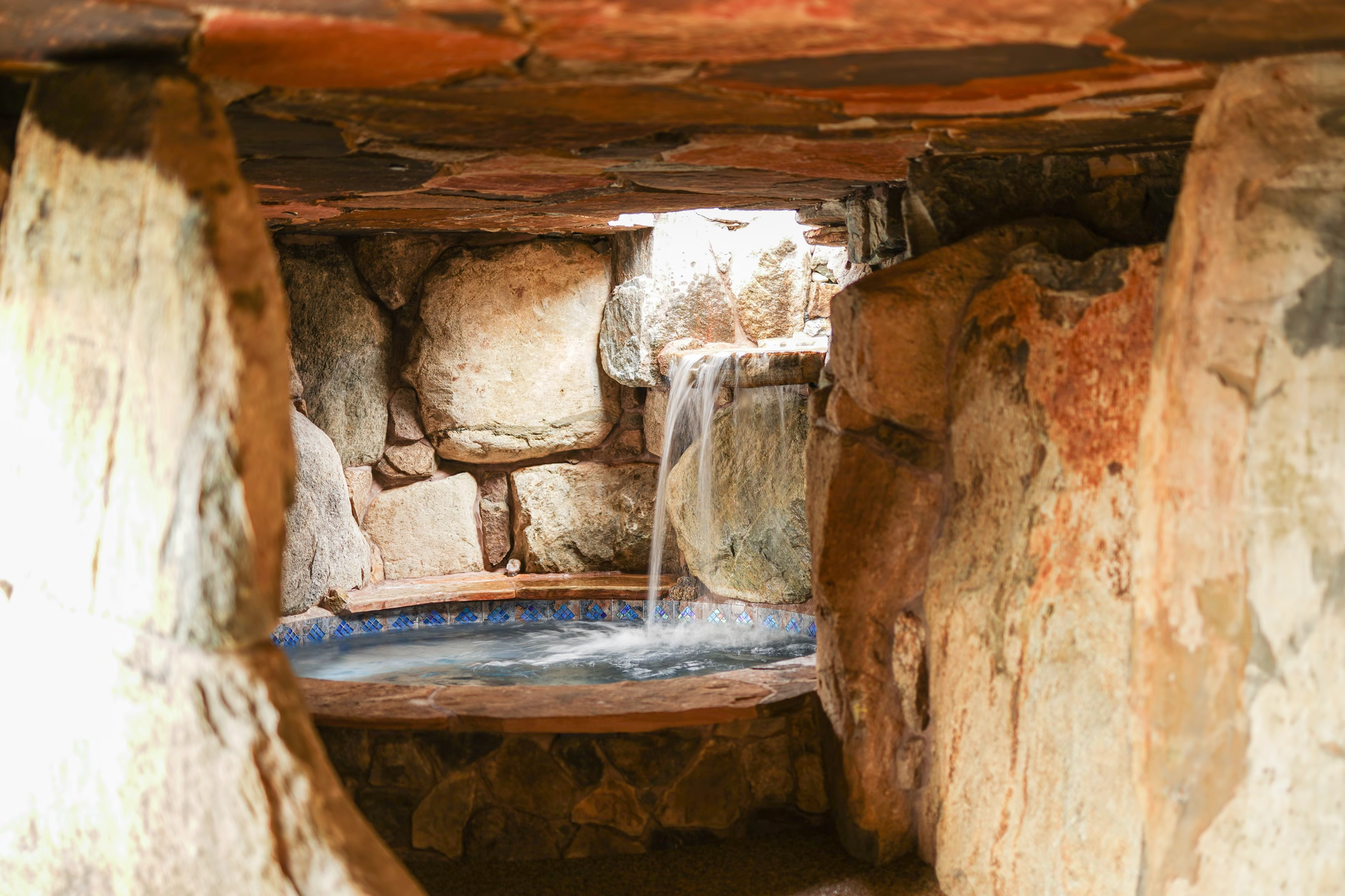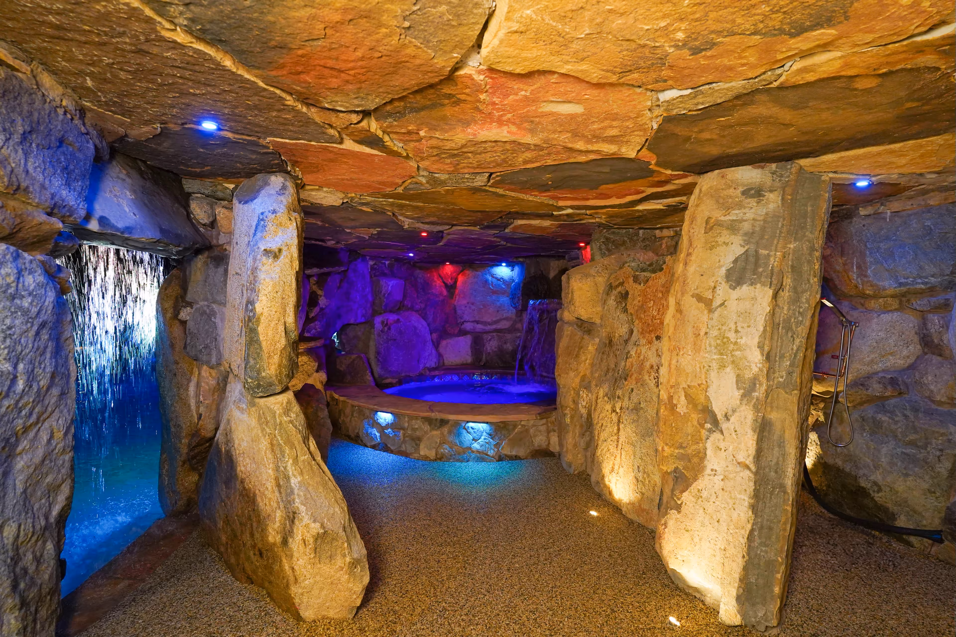 Aquatic Artists designed and built the ultimate backyard oasis with multiple water features that flow into this custom gunite pool in Williamstown, NJ. First, we crafted a custom waterfall grotto cave that is 8 feet wide and 16 feet deep and is made of all natural stone. The grotto cave is half wet and half dry. The dry portion of the grotto cave has a separate side entrance and sitting area inside with a natural rock floor. This is a great feature if you want to access the grotto and do not want to get wet. Also to enhance the rustic look of the cave, we incorporated three authentic red cedar logs inside the ceiling of the cave.
