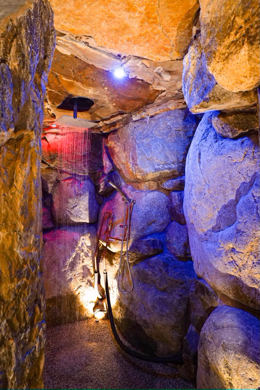 Aquatic Artists crafted this large Ultimate Grotto System on a gunite pool in Finksburg, MD. The grotto system measures approximately 7’ tall and 35’ wide. It also features wet and dry grottos, multiple waterfalls, spa integration inside the grotto, lighting throughout, an outdoor shower in the grotto, Resin Rock flooring, and boulder retaining walls.