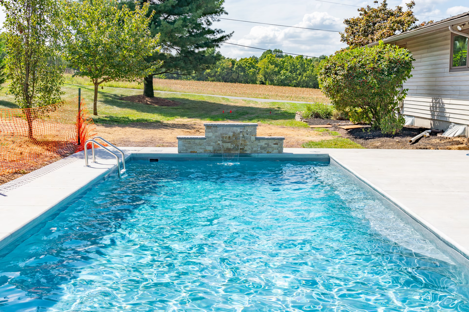 Aquatic Artists designed and built this custom formal waterfall on this fiberglass pool in Mullica Hill, NJ. The waterfall is handcrafted featuring Picasso Travertine Tan Veneer with a gray cast concrete rock face cap and features a 24 inch sheer descent of water cascading into the pool. Also, the overall structure of this water feature is 2 feet high by 8 feet.
