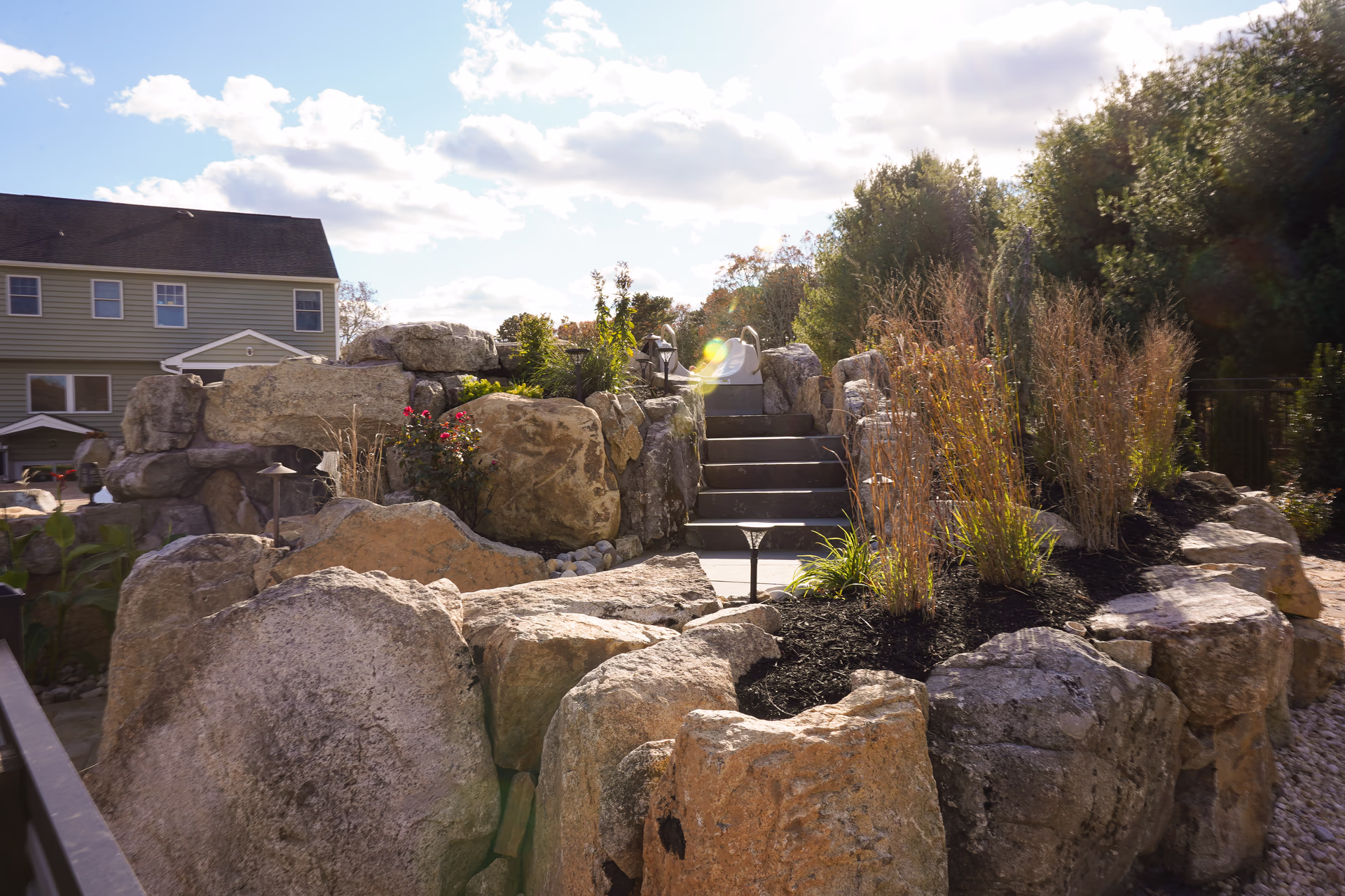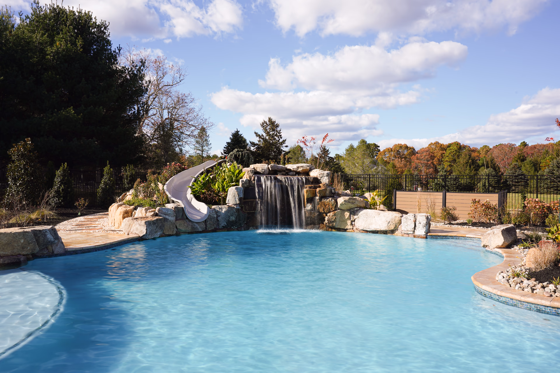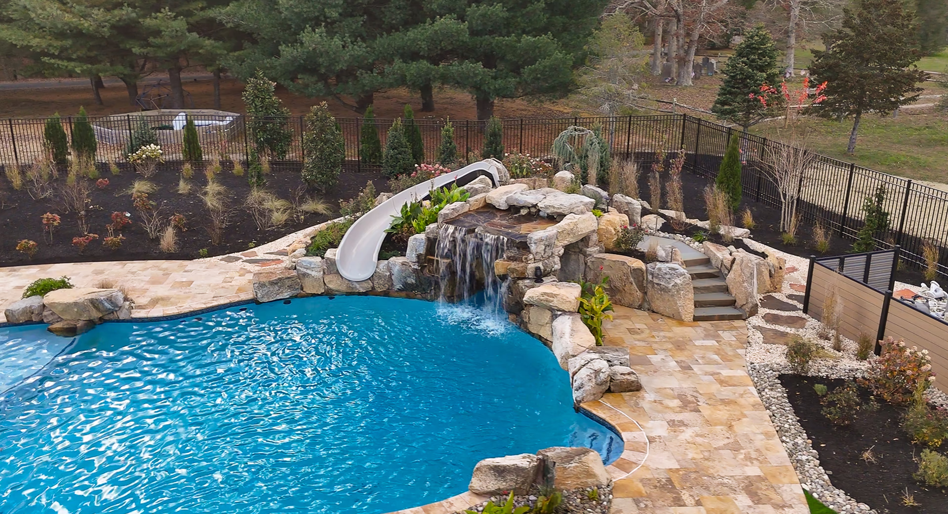 Aquatic Artists crafted this Deluxe grotto and slide project on this gunite pool in Port Republic, NJ. The grotto we built is 5′ high by 5’ wide and 5’ deep and the pool slide is 15’ long. Leading to the pool slide, we built natural stone steps, and we built a boulder wall on the back of the water feature. Also, Aquatic Artists designed and built the entire backyard including patios, firepit, sport court, landscaping, lighting, irrigation, spa installation, and custom stonework.